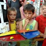Xavier Cloet, ook één van de initiatoren, vertelt een gelijkwaardige voorgeschiedenis van een andere artiest. “Ik liep op een rommelmarkt, waar een man op alles wat hij verkocht kon spelen. Ik heb hem gevraagd of hij dat niet bij ons wilde komen doen. Helemaal vergeten daarna, totdat hij gisteren bij ons aan de poort stond.” Een bekend gezelschap op het veldje is trouwens de Nederlandse groep ‘De Stijle, Want’ met hun Lunapark. Jarenlang stonden ze op De Parade, Oerol en waar eigenlijk niet en ze voelen zich enorm goed hier in dit gezelschap.