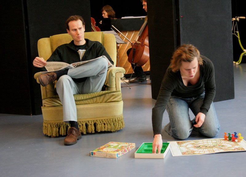Woensdagmorgen verzamelen we in de hal van Jeugdtheaterhuis de Berekuil voor een presentatie van Katharina Katharina in het ganzenbord. Als we met een groepje van voornamelijk recensenten en fotografen om de tafel zitten met koffie en koekjes komt Monique Corvers, artistiek leider van het gezelschap en regisseuse, vertellen over het Filiaal en de voorstelling. Monique vertelt dat ze zich als regisseuse als een vis in het water voelt nu ze, na de voorstelling Assepoes, opnieuw met een wat grotere cast en in samenwerking met een muzikaal ensemble aan het werk kon. Dit geldt ook voor de Hongaars-Canadese componist G bor Tarj n. Al lezend, spelend, pratend en luisterend naar elkaar en hun gezelschap krijgen de ideeën duidelijker vorm en bouwen Monique Corvers en G bor Tarj n de voorstelling theatraal en muzikaal op. Ook voor de spelers en muzikanten is ruimte om met hun interpretatie van het stuk, de muziek te komen, zodat de creativiteit van iedereen gebruikt wordt en de beste ideeën verwerkt kunnen worden. De integratie van deze twee disciplines gaat zo op een natuurlijke manier. Bovendien kunnen de acteurs (kleinkunstenaars) in Katharina Katharina ook goed zingen, de zanger speelt wat hij zingt en de muzikanten zijn, omdat ze goed en ingeleefd spelen, mooi om naar te kijken.