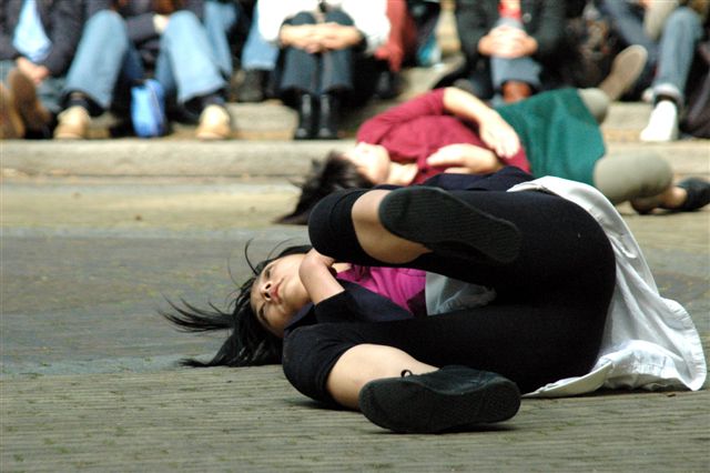 De tien dansers, jonge maar ook oudere, mannen en vrouwen en allen smaakvol casual gekleed in colbert met pantalon danwel rokje, zijn gedurende 50 minuten continu in beweging. En hoe! Soms ontwijken ze elkaar zeer bewust, niet zelden botsen ze nonchalant tegen elkaar aan. Er wordt gerend, gestrompeld, gelift en fysieke confrontaties zijn niet van de lucht. Fysiek contact met elkaar. Maar ook fysiek contact met de (harde) stenen grond. Er wordt veel over de grond gerold en gevallen. Ja, gevallen; languit op de grond vanuit een staande beweging…. “Deze dansvorm is wel even anders dansen dan in de zaal op een verende ondergrond” aldus danser Sasker Polman.
