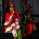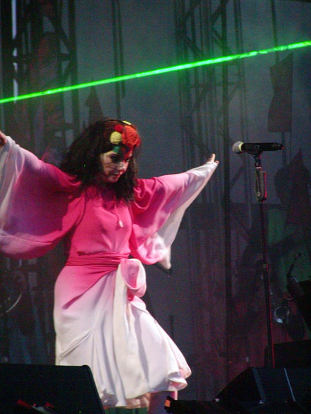 Dan klinken lekkere zware nummers als ‘Army of me’ (‘Post’) en ‘Innocence’ (‘Volta’). Het publiek is al opgewarmd, maar een feestje wordt het pas bij ‘I miss you’ (‘Post’). Overigens niet door toedoen van Björk, maar de man achter de Macbook, die op en neer springt en meeklapt. H ÂÂj is degene die het publiek meekrijgt. Björk zelf fladdert als een losgebroken vlinder over het podium. Luchtdrumt vaak mee en trekt gekke gezichten zoals we die van haar kennen uit videoclips. Haar stem is niet standvastig, maar bij een muzikaal kunstenares als Björk, met een toch al ongewone stem die vooral drijft op een ongelooflijke portie lef, maakt dat niet uit.