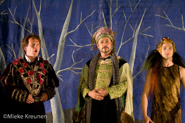 Als toeschouwer op de geïmproviseerde buitentribune (kussentje meenemen is aan te bevelen) zit je eigenlijk aan één stuk door ademloos te kijken naar de uitstekend geregisseerde en tot in de kleine details verzorgde uitvoering. Ik moest af en toe zelfs momenten schaterlachen, nota bene bij een “klassiek” stuk van Shakespeare! Het decor is werkelijk prachtig vervaardigd met bomen van gevlochten beton waarop met theaterlichten sfeervolle effecten worden bereikt. Je waant je ook werkelijk in het op deze wijze gecreëerde nachtelijke bos, waarin zich eigenlijk het grootste gedeelte van het verhaal afspeelt: in de sprookjeswereld van de feeën en elfen. Op zich wel gek maar tegelijk leuk dat het bos van het stuk als decor op een abstracte wijze wordt vormgegeven, terwijl je als toeschouwer midden in een écht bos zit en ook het podium als het ware helemaal omgeven wordt door echte bomen.