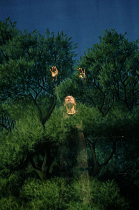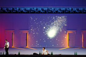 Het probleem in deze regie is alleen dat Konwitschny allerlei thema’s en ideeën aanraakt, maar geen consistente keuzes maakt, waardoor de regie een aaneenschakeling van losse fragmenten wordt. Al in het begin van de opera komt het mannenkoor op als de schaapskudde van de herder Leukippos (Rainer Trost). Een leuke vondst die ook goed werkt, alleen zijn de schapen, vanwege het Dyonisische feest, ook dronken. Die combinatie is net te veel en de hele opera hinkt eigenlijk continue op te veel gedachten. Leukippos heeft een gele bos haar en een bril die Buddy Holly niet zo misstaan, hij lijkt daardoor op een Belgische stripheld uit de jaren 50. Daphne (Juanita Lascarro) heeft een kort rokje en twee recht omhoog staande staartjes en roept daardoor associaties op met Wiske. Daphne’s moeder Gaea (Birgit Remmert) probeert ervoor te zorgen dat Daphne wat meer open staat voor de interesse van de mannen. Als het feest begint komt ze als een Bianca Castafiore op maakt Apollo (Scott MacAllister) de stripconnectie compleet als hij als een echte Jerommeke het toneel opkomt en Daphne voor zich probeert te winnen.