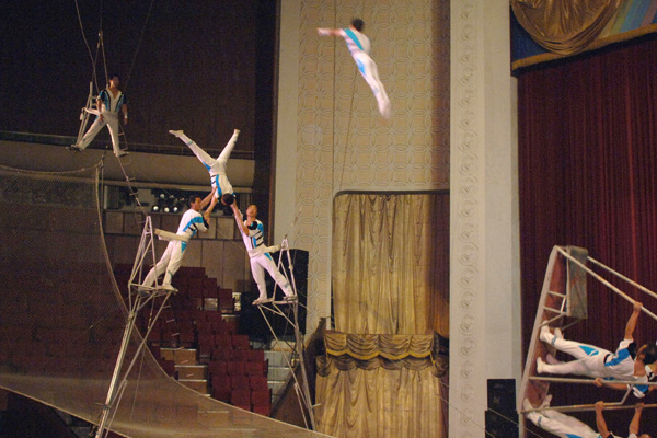 De artiesten tonen de meest ontzagwekkende hoogstanden, vooral op acrobatisch vlak. Het trapezenummer “De Hemelse Wereld” met Kim Song Sam, Ri Hak Song en Kim Yong Gyong, en het nummer “Rolla Rolla”, waar Kim Yong Thaek halsbrekende toeren uithaalt op een aantal cilinders, zijn adembenemend. De opbouw binnen deze nummers is enorm, het totale publiek houdt de adem in en je kunt een speld horen vallen. Niet altijd lukt een sprong de eerste keer. Maar de enkele keer dat dit zich voordoet, doen de acrobatendirect een nieuwe poging. Dit is duidelijk een cultuurverschil waar wij aan moeten wennen. Storend is het allerminst. Het draagt bij aan het besef van de moeilijkheid en complexiteit van de acts.