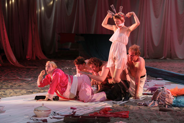 Misschien was het juist de bedoeling dat het geheel overkwam als een aan elkaar geplakte puzzel, waarbij de meeste puzzelstukjes ontbraken, maar alle repen stof en alle stukken gordijn konden helaas toch niet verhullen dat het stuk in feite gewoon nog niet “af” was. Dat Alma een nymfomaan bestaan heeft geleid was na tien minuten al duidelijk. En blijkbaar hield haar echtgenoot van “amputatie-sex” en had één van zijn te vroeg geboren kinderen een groot waterhoofd. Maar wat zich verder gedurende de bijna anderhalf uur durende voorstelling afspeelde werd mij niet duidelijk. Verder dan het niveau van een wat uit de hand gelopen improvisatie kwam het stuk naar mijn mening dan ook niet.