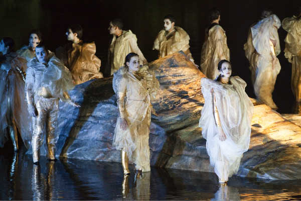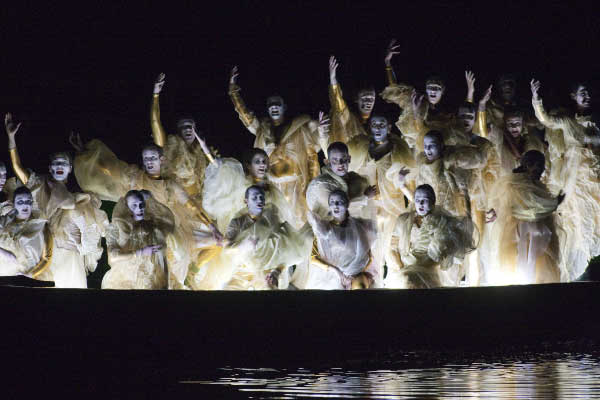 De locatie is prachtig, de natuur rondom de vijver - met gevoel voor nuance belicht - is schilderachtig en de natuur, die volop leeft in de invallende duisternis, is naast countertenor Gary Boyce en sopraan Stefanie True de derde hoofdrolspeler. Prachtige beelden trekken voorbij op het spiegelende water terwijl Orfeo zijn liefde voor en verdriet over Euridice bezingt. De oeheo die al even over het water scheerde en is getraind om op de hand van Orfeo te landen, kiest dit keer voor de rots waar hij gelukkig even blijft zitten dank zij het vlees dat Orfeo hem toewerpt. De klanken van orkest en het koor klinken prachtig in de schermering, die van Orfeo gaan door merg en been.