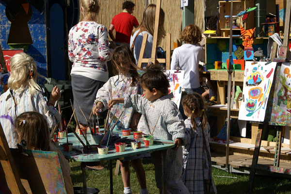Er was naast de kindervoorstellingen nog veel meer te doen: schilderen in Atelier Villa Lila, je hoogstpersoonlijke T-shirt maken in de mobiele T-shirtdrukkerij en wat ook erg leuk is: de Silent Disco, een kooi waarin je met z’n allen kunt dansen met een koptelefoon op. Niet heel sociaal, maar wel lekker rustig!