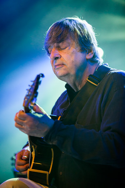 Met 5 dezelfde instrumenten is het altijd maar weer afwachten wat er gaat gebeuren. Gelukkig gaat dit met gitaren heel goed en deze 5 heren laten het ook zeker niet in een brei van geluid verzanden. Het kwartet begint zonder Philip en warmt het publiek op met mooie en goed gespeelde stukken van alle muzikanten. Dan gaat Larry er eens alleen voor zitten en kondigt zijn “Disarrangement” van Ravel’s Bolera aan. En inderdaad, hij scheurt het stuk uiteen en lijmt het vervolgens op zijn geheel eigen manier weer aan elkaar. Hij heeft er zichtbaar plezier en in hoeft nu ook niet van papier te lezen. Het publiek is gefascineerd en zit op de punt van hun stoel. Daarna komt Philip op en samen spelen zij de sterren van de hemel. Zo gemakkelijk en toch virtuoos kom je maar zelden tegen. Perfect samenspelend en op elkaar reagerend nemen ze een aantal stukken door die allemaal goed in de smaak van het publiek vallen. Vervolgens sluiten ze af met alle 5 gitaristen met nog een stuk een en toegift.