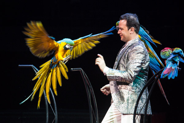 Tot slot willen we graag melding maken van het papegaaiennummer van Alessio. Hoewel staatssecretaris Dijksma het verbod op wilde dieren in het circus per 1 januari 2015 heeft afgekondigd, moet ons van het hart dat wij zeer onder de indruk waren van het papegaaiennummer van het Wereldkerstcircus. De acht prachtig gekleurde majestueuze vogels vliegen vrij door de piste tot hoog in de nok van Carré. Als er eentje zin heeft om op de arm van een toeschouwer te landen, dan kan dat gewoon. Dat is meer dan menig papegaai in een Nederlandse huiskamer ooit in zijn leven zal meemaken.