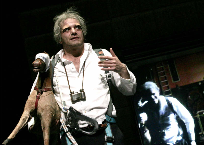 Doodstil wordt het, in het volledig gevulde Zaantheater als de lichten doven. Op het podium staat een pakhuis, waarvan de garagedeuren langzaam opengaan. Erachter en groot beeldscherm, waarop een man zichtbaar is, die langzaam naar voren loopt. Pas na enige tijd wordt duidelijk, dat de beelden live-opnamen zijn van wat er op het podium gebeurt. Vanuit de coulissen komt een oude man het podium opgelopen. De stilte houdt aan, terwijl hij langzaam naar de andere kant van het podium loopt. Dan een voorzichtig gelach.
