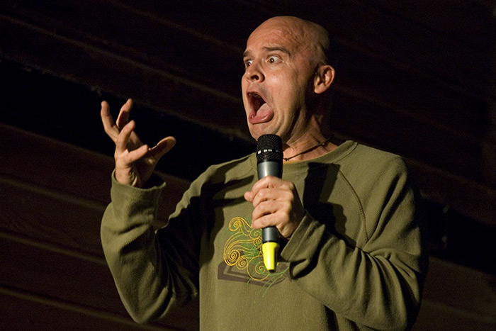 Er waren te weinig bezoekers om de voorstelling in het theater te houden en het aanwezige publiek kon op het overdekte terras blijven zitten. Zo kon de voorspelde regen geen roet in het eten gooien en er werd een tegelijkertijd een intieme sfeer gecreeerd die de standup comedy juist zo speciaal maakt. Er was slechts een verhoging neergelegd en daar ging het vanavond allemaal gebeuren.