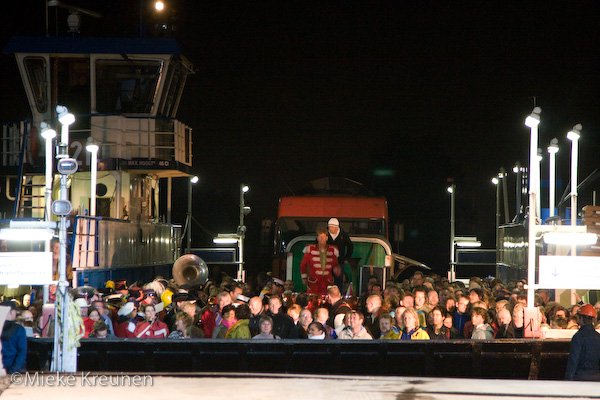 Als wij aankomen is het tamelijk donker op het terrein want de hoofdstroomkabel is zojuist kapot gegaan. Een ramp natuurlijk maar gelukkig komt de oplossing via de collega's van Robodock die een leenkabel beschikbaar stellen. Op signaal van de productieleidster kan de pont uitvaren en het feest beginnen.
